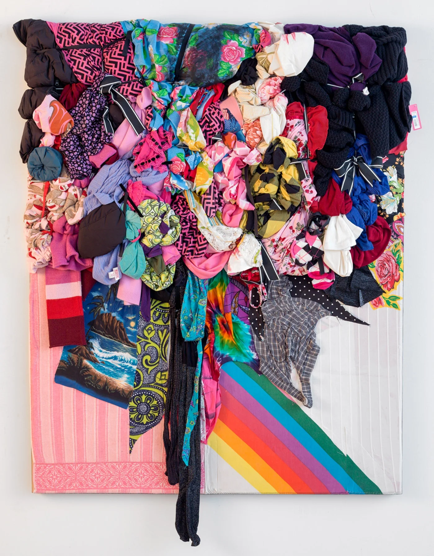 Shinique Smith. Bright Matter, 2013. Clothing and fabric culled from Los Angeles and ribbon on wood panel, 63 x 52 x 5 inches.