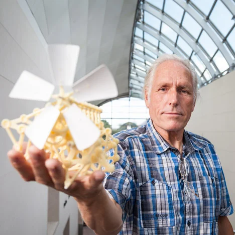 Theo Jansen was originally a Physicist but switched his career to become a painter in the 70s. Fallowing his interests in aeronautics and robotics he began his project with creating artificial life through algorithm programs sparking his "Strandbeest" (beach beasts) kinetic sculptures. Story has it in 1980 that he crafted a UFO sculpture that emitted sound and launched it into the sky and the town broke out into an apocalyptic panic. After this event he was hooked on creating these life forms. He currently works in his laboratory creating more of these beach walkers and then sets them free on the Dutch coastline in herds. For a video to watch them in action click here.